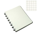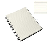 At first glance, an Atoma notebook looks similar to any other notebook. But when you really have a look at it, you will see that the binding rings are actually indented discs. This design is fundamental to the concept of Atoma: it means that, unlike a spiral notebook, you can remove pages without having to tear them out. And you can add pages simply by pressing them onto the discs, unlike a binder where the rings need to be pulled apart beforehand. So how can you do this? Well, rather than being punched with holes, the sheets have T-shaped cuts. These enable the paper to be 'hooked' around the outer rim of the disc. And if you have an Atoma Paper Puncher, you can make these cuts in any type of paper - scrap paper, newspaper, a drawing or photograph - which you can then add to your notebook. The discs are separate - i.e. they are not attached to a 'spine' of any sort, and don't exist as a continuous spiral. This means that although Atoma notebooks come in three standard sizes, you can actually create your own size of notebook just by deciding how many discs you want to use: the size of the discs will determine how thick your personalised notebook may become!