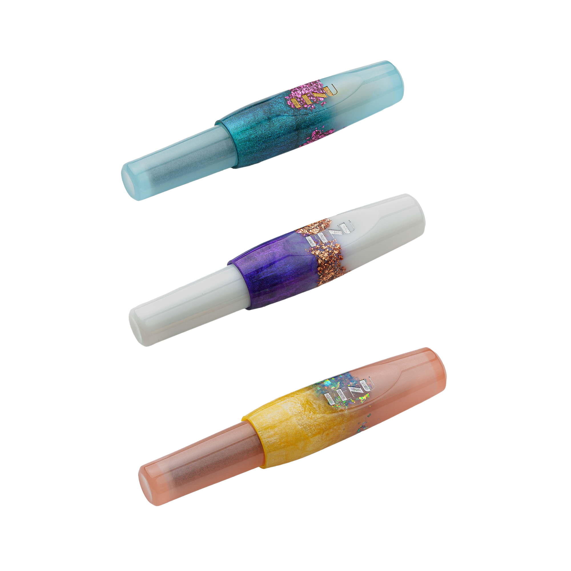 Luminous Haze Set consists of three Pixie fountain pens, in different colours, and they all glow in the dark! Each pen has a different main colour, and shimmering metallic flakes. They'll glow in the dark after being exposed to light to 'charge' up. Sunlight is best, LEDs make less of a glow - but don't overheat them when charging.