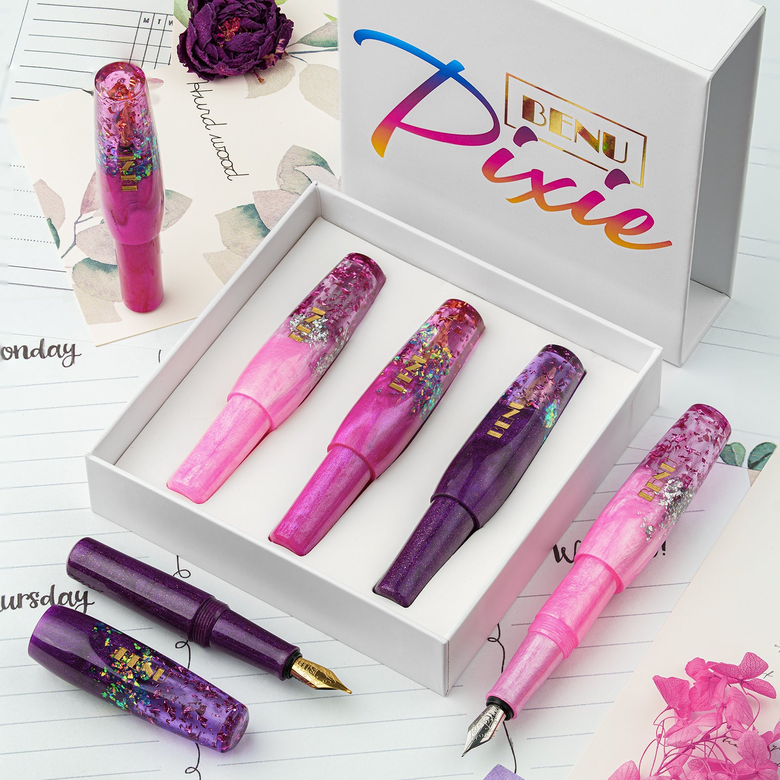 Magenta Madness Set consists of three Pixie fountain pens, in different vivid colours - fuchsia, hot pink, and electric berry, all with glitter embedded in the translucent caps.