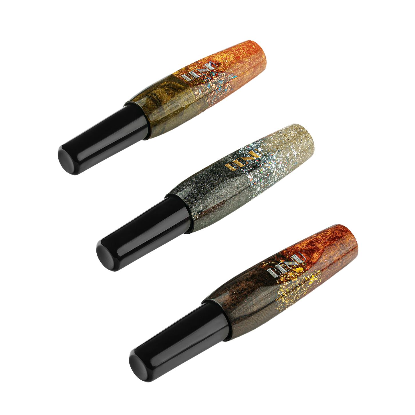 Metallic Dust Set consists of three Pixie fountain pens, in different finishes. All have dark and moody resins, but with the addition of different metallic shades of gold, copper and silver.