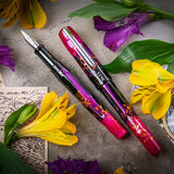 Pink, Purple and black fountain pen made from high quality resin with shimmering orange inserts. #6 Schmidt stainless steel nib available in a range of nib sizes and screw on cap that can be posted.