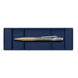 A real original, the Caran d'Ache 849 ballpoint has been in production since 1969, and has oft been the subject of special editions. The lightweight, hexagonal aluminium body is resplendent in gold and grey, the result of tribofinition, which involves placing unfinished elements in tumblers with metallic parts to create this type of surface finish. The clip and push button are velour chrome grey.