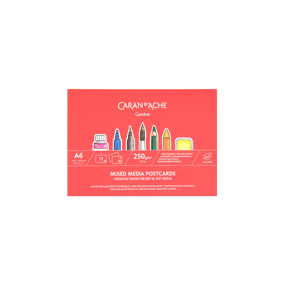 Pack of 12 A6 sized plain postcards with space for an address and a message on the back. Hot pressed, 250gsm thin card, suitable for all types of wet and dry media including paint, markers, fibre-tip pens, coloured pencil and pastel.