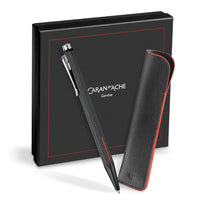 Caran d'Ache Ecridor Racing Ballpoint. Classic CdA solid brass hexagonal barrel is engraved with a textured pattern in black, set off by a subtle red 'go faster' stripe. The end cap is engraved with the Caran d'Ache logo. The strong metal clip is elegant yet sturdily functional.