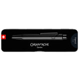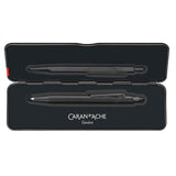 2mm lead version of the Fixpencil. Matt-black aluminium barrel, part of Caran d'Ache's Black Edition collection; rough textured grip section; removable metal pocket clip in traditional Caran d'Ache style; plastic push-button with integral sharpener.
