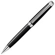 Caran d'Ache Leman Ebony mechanical pencil. This classically-profiled pencil has a gloss finish complemented by silver-plated, rhodium-coated accents. The pocket clip is hinged, and the barrel ring is inscribed with 'Caran d'Ache' and 'Swiss made'.