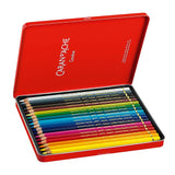 Tin of 18 Caran d'Ache Pablo permanent coloured pencils. Contains one each of White, Grey, Black, Yellow, Orange, Raw Umber, Burnt Siena, Scarlet, Carmine, Purple, Violet, Ultramarine, Cobalt Blue, Turquoise Blue, Malachite Green, Grass Green, Lemon Yellow and Light Olive.