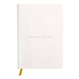 A5 notebook with 180 thread-bound pages of 90gsm smooth, acid-free ivory paper. Fabric page marker and a choice of page layouts. Vegetable-tanned, tactile leather cover in cool white.