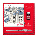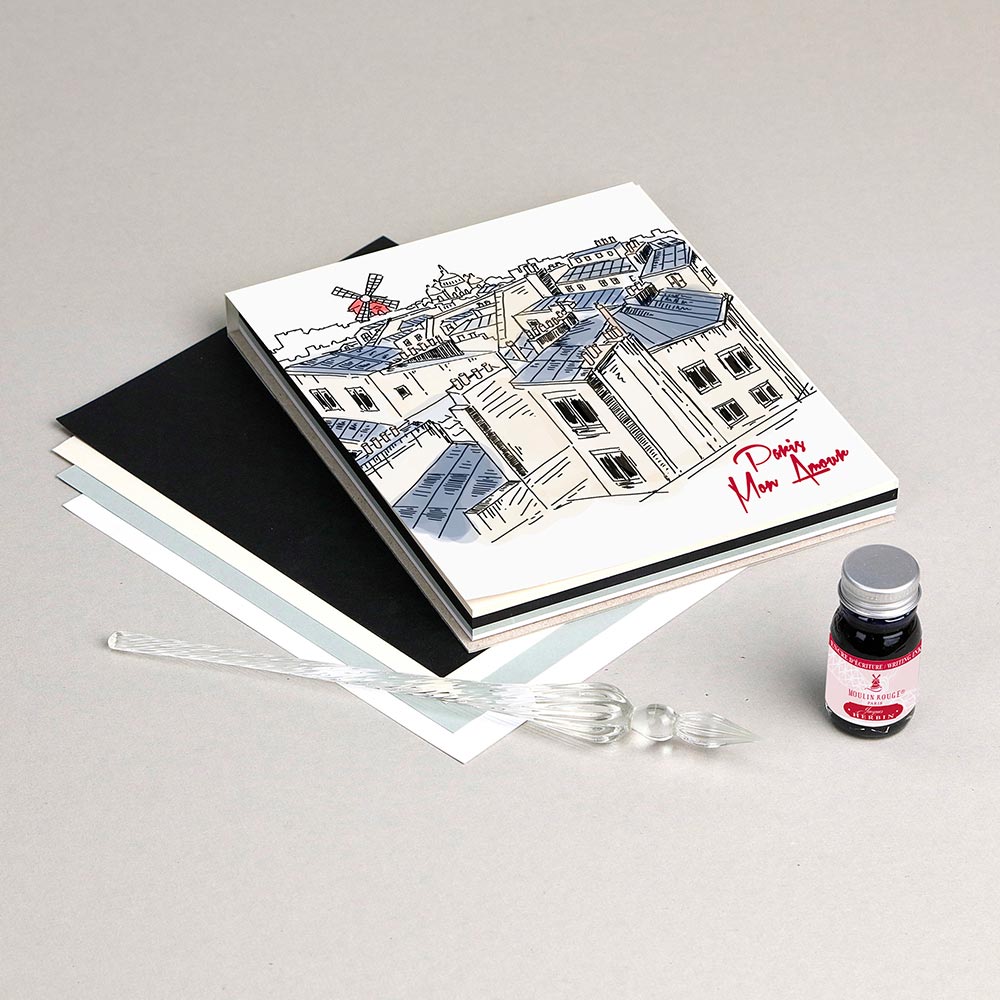 The calligraphy set comes with a glass pen with a 10ml bottle of Moulin Rouge ink, and a calligraphy pad with varied paper weights and colours with 52 sheets total. FSC certified.