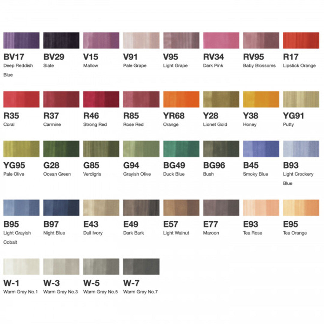 With a flexible brush nib at one end and an angled chisel nib at the other, Ciao offers a dynamic double ended alcohol-based marker. It's a popular option among students and beginner especially. The 180 colour option is a more refined selection than the Sketch and the Classic but an emphasis has been placed on selecting shades that are both easy to layer and blend.