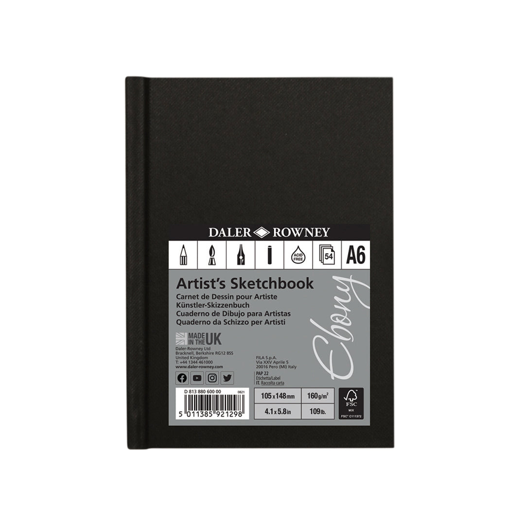 The Ebony Sketchbook comes with 54 sheets of high quality 160gsm paper. The sturdy, ebony black hardback cover protects your work making it an ideal travel companion.