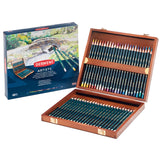 With the Derwent Artist coloured pencils, you're spoilt for choice when it comes to colours. Of the 120 available, this beautiful wooden box contains 48: Lemon Cadmium, Straw Yellow, Deep Cadmium, Orange Chrome, Scarlet Lake, Deep Vermilion, Flesh Pink, Salmon, Rose Pink, Crimson Lake, Magenta, Imperial Purple, Dark Violet, Light Violet, Blue Violet, Ultramarine, Spectrum Blue, Sky Blue, Prussian Blue, Indigo, Phthalo Blue, Kingfisher Blue, Jade Green, Cobalt Green, Spruce Green, Mineral Green, Emerald Green, Grass Green, May Green, Cedar Green, Olive Green, Chartreuse, Parchment, Bronze, Burnt Umber, Vandyke Brown, Brown Ochre, Raw Sienna, Golden Brown, Copper Beech, Terracotta, Light Rust, Burnt Rose, Taupe, Ivory Black, Blue Grey, Gunmetal and Chinese White.