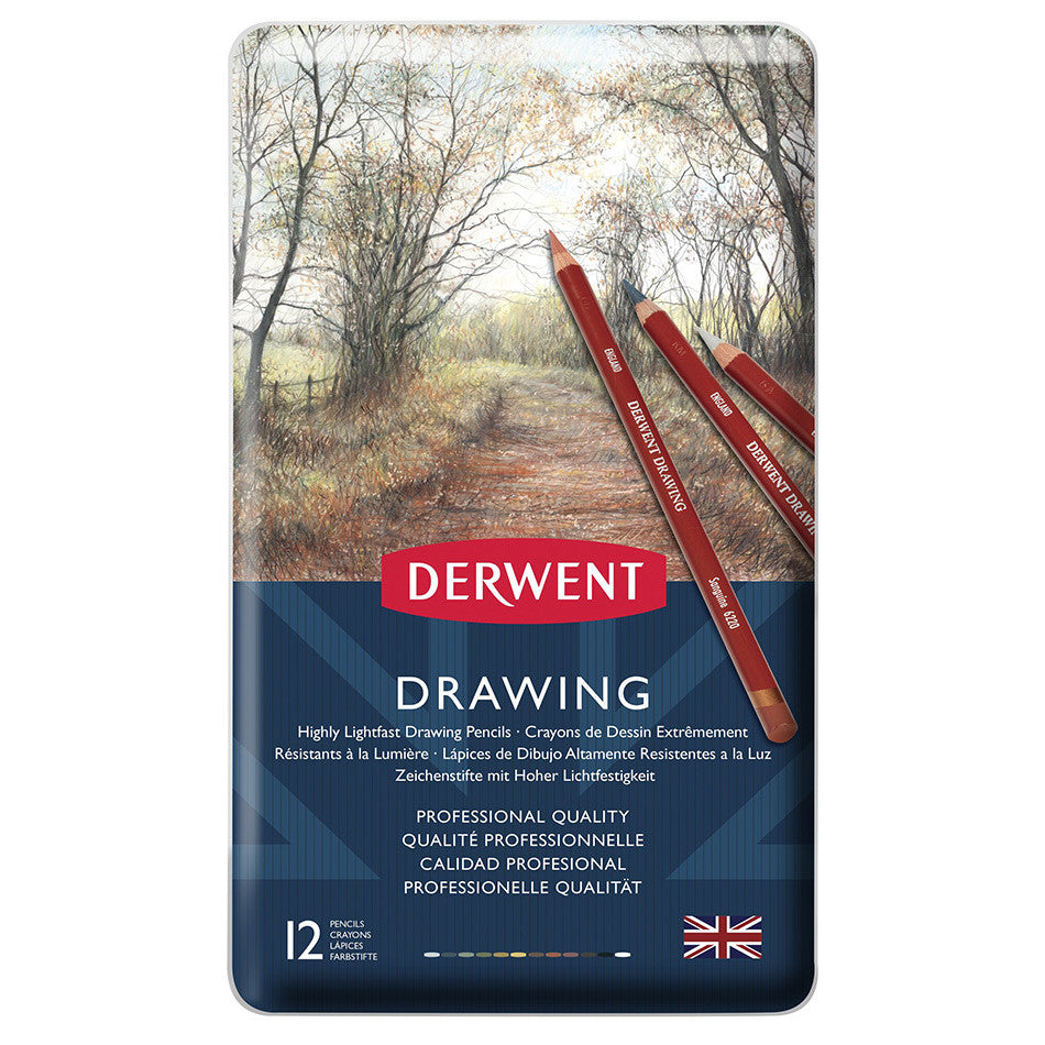 Ttin of 12 pencils includes one each of: Solway Blue, Ink Blue, Green Shadow, Olive Earth, Brown Ochre, Yellow Ochre, Sepia Red, Sanguine, Ruby Earth, Chocolate, Ivory Black and Chinese White.