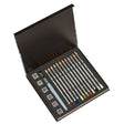 The set contains 12 Graphitint pencils which, when used dry, offer subtle colour but when wet produce a glorious sheen. Colours include Port, Aubergine, Dark Indigo, Shadow, Meadow, Ivy, Chestnut, Russet, Storm, Midnight Black, Cloud Grey and White.