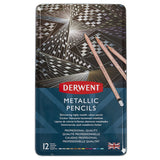 Tin of 12 Derwent Metallic Pencils. Professional quality coloured pencil with shimmering, iridescent lead.