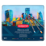 Cylindrical barrel and 4mm break-resistant core. Tin of 24 contains one each of Pimrose Yellow, Buttercup Yellow, Deep Chrome, Primary Red, Crimson Lake, Cerise Pink, Heather, Imperial Purple, Prussian Blue, Spectrum Blue, Midnight Blue, Distant Green, Sap Green, Cedar Green, Grass Green, Foliage, Burnt Umber, Brown Ochre, Sunset Gold, Nutmeg, Gunmetal, Blue Grey, Ivory Black and Procolour White.