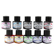 Set of 10 colours of water-based, acid-free, vegan-friendly ink, each contained within a 12ml bottle. Amber, Apple Glory, Beau Blue, Chocolate Brown, Jet Black, Majestic Purple, Passion Red, Sapphire Blue, Sultry Strawberry and Yellow.