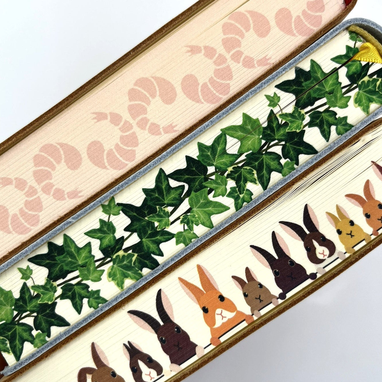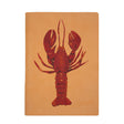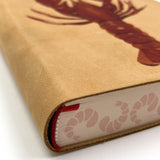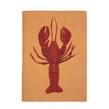 Premium handmade nabuk leather covered notebook with a depiction of a red lobster on the front cover and yellow page marker. Each journal features 192 pages of 110 gsm lined ivory paper. The leather cover has a suede feeling and the size of the journal means it feels more like a book than a standard journal. The page ends are coloured red.