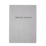 Premium handmade bonded leather with saffiano grain covered notebook with 'write well edit often' printed on the front cover with yellow page marker. Each journal features 112 pages of 110 gsm lined ivory paper.