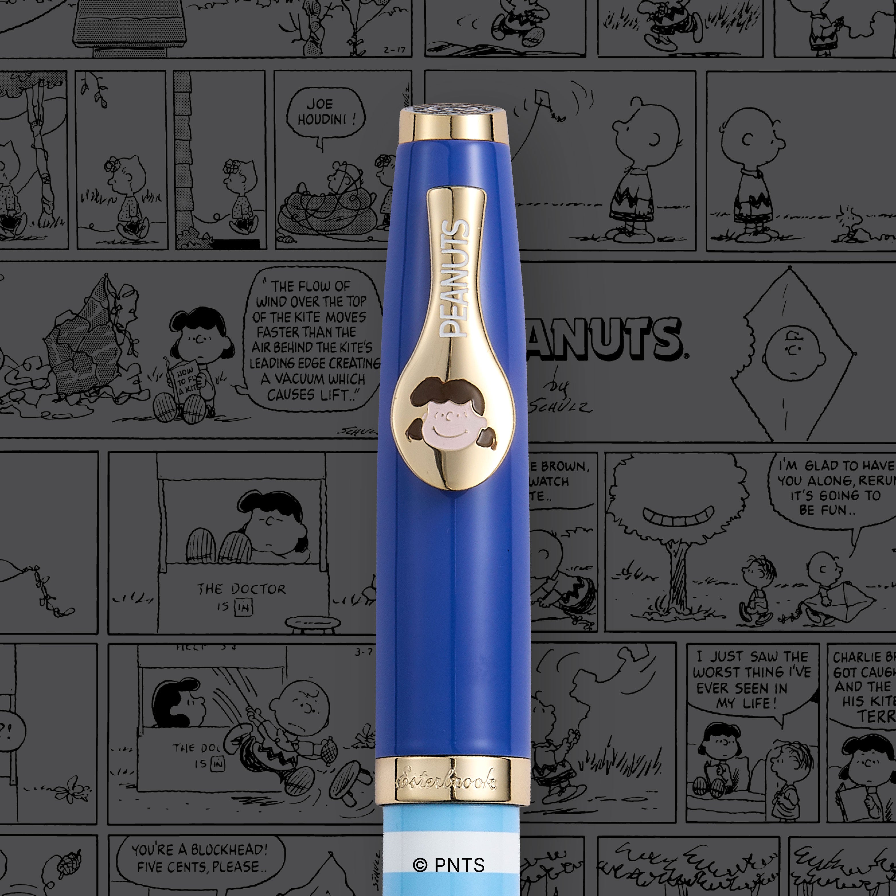 Lucy Estie fountain pen features colours to match Lucy's outfit, her face on the wide clip, and a 'Good Grief!' think bubble engraved on the nib.