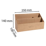 Measures 250 x 100 x 140 mm. 3 compartments; 1 large compartment 240 mm long that fits C5 (220 x 110mm) envelopes, 1 medium compartment that fits C6 (162 x 114mm) envelopes and 1 small compartment that can be used as a pencil pot.