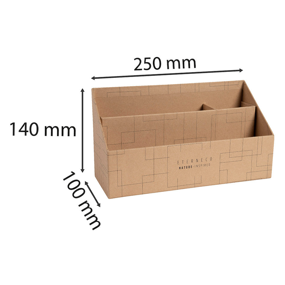 Exacompta Eterneco brown letter holder with 3 compartments. Made from recycled cardboard, covered with Teksto card and coated with vegetable oil to make it water resistant. Slanted shape to use with different heights of paper and there is even space for your pens and pencils. Durable and easy to recycle.