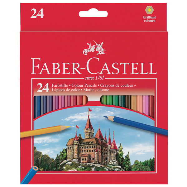 Pack of 24 Faber-Castell 'Castle' colour pencils with hexagonal barrel in assorted colours. Brilliant colour with smooth colour laydown. SV-bonded lead to reduce breakage. Water-based eco paint finish. Sharpen with any standard sharpener.