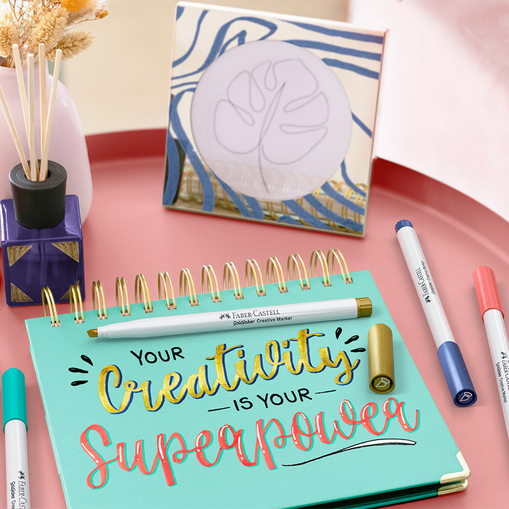 Set of six colours of Faber-Castell Creative Markers. Fibre-tipped pen with a angled italic calligraphy tip. Will mark most surfaces, including paper, cardboard, glass, plastic, metal and stone. Odourless, water-based ink which is smudge- and splash-proof. After fixation in the oven at 160°C the ink is waterproof, but not dishwasher-proof. No need to shake or pump.