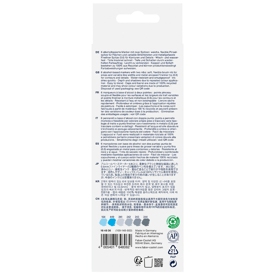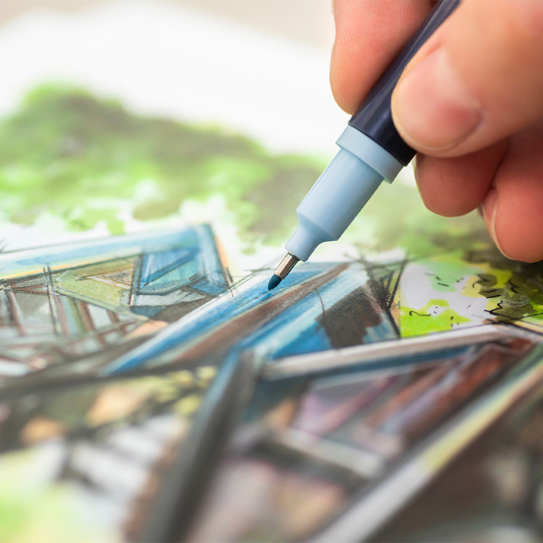 This alcohol-based sketch marker features two nibs: a soft flexible brush tip for artistic work and a metal-encased fineliner tip which creates a 0.4mm line for contours and finer details.