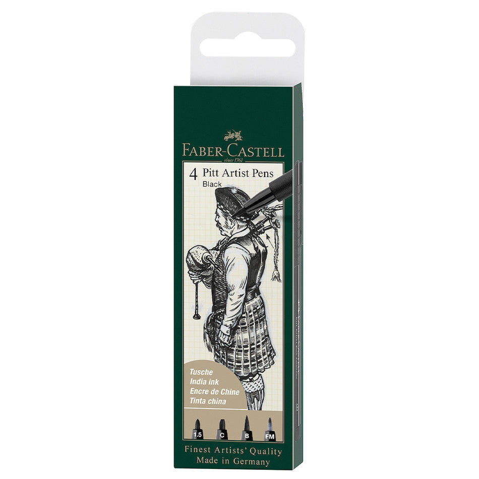 Wallet of four Faber-Castell Pitt Artists' Drawing Pen. Lightfast, waterproof pigment ink, suitable for drawing, sketching and all art purposes. Each wallet contains one of each nib size: 1.5mm Bullet Nib, Brush, 2.5mm Calligraphy Nib and FM in black.