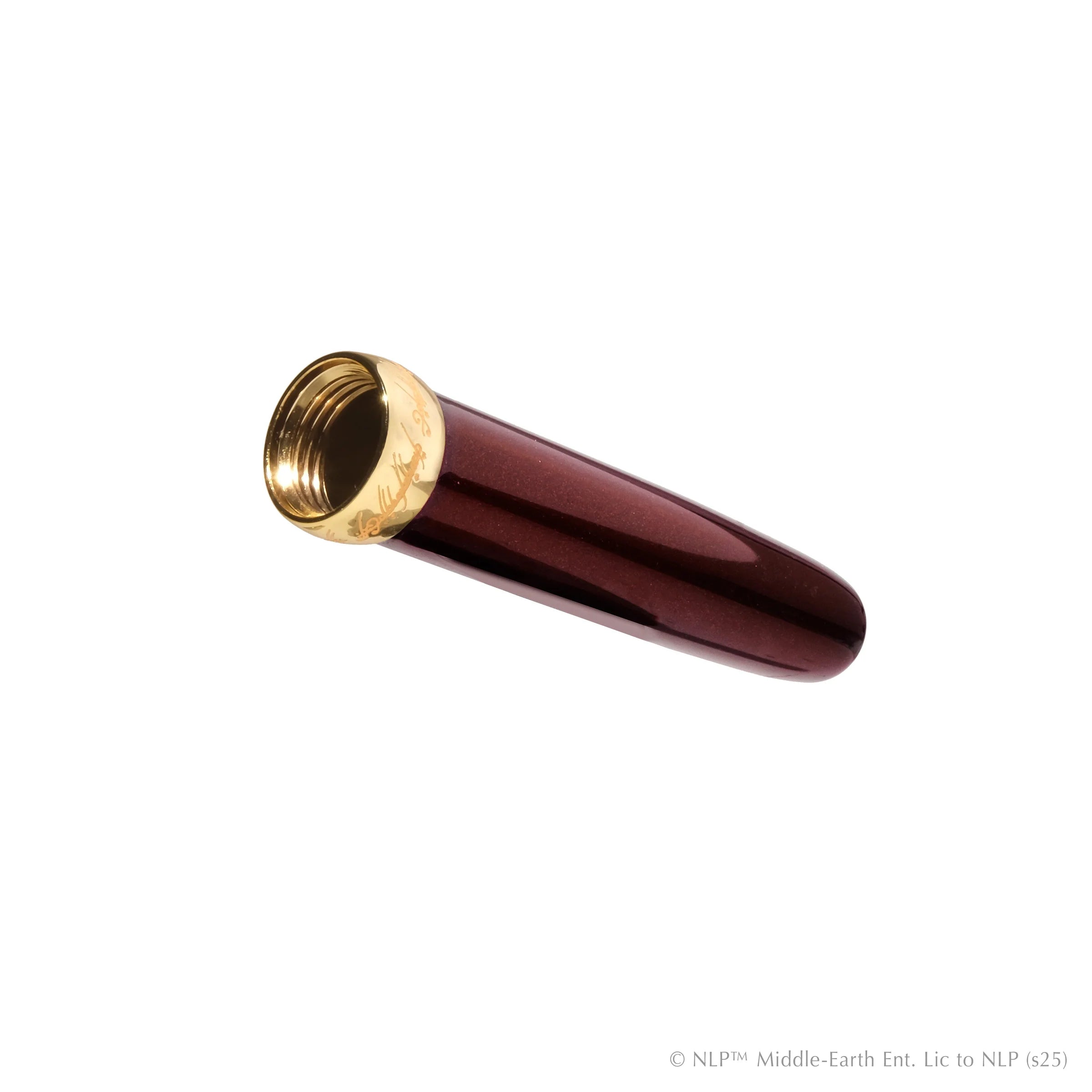 The barrel of the pen is a dark red, and is accented by an intricately designed grip. The grip is etched with an image of the Black Gates of Mordor, bracketed by a silhouette of his helmet, and the top Barad-Dur along with his fiery Eye. The cap also features an etched design of The One Ring.