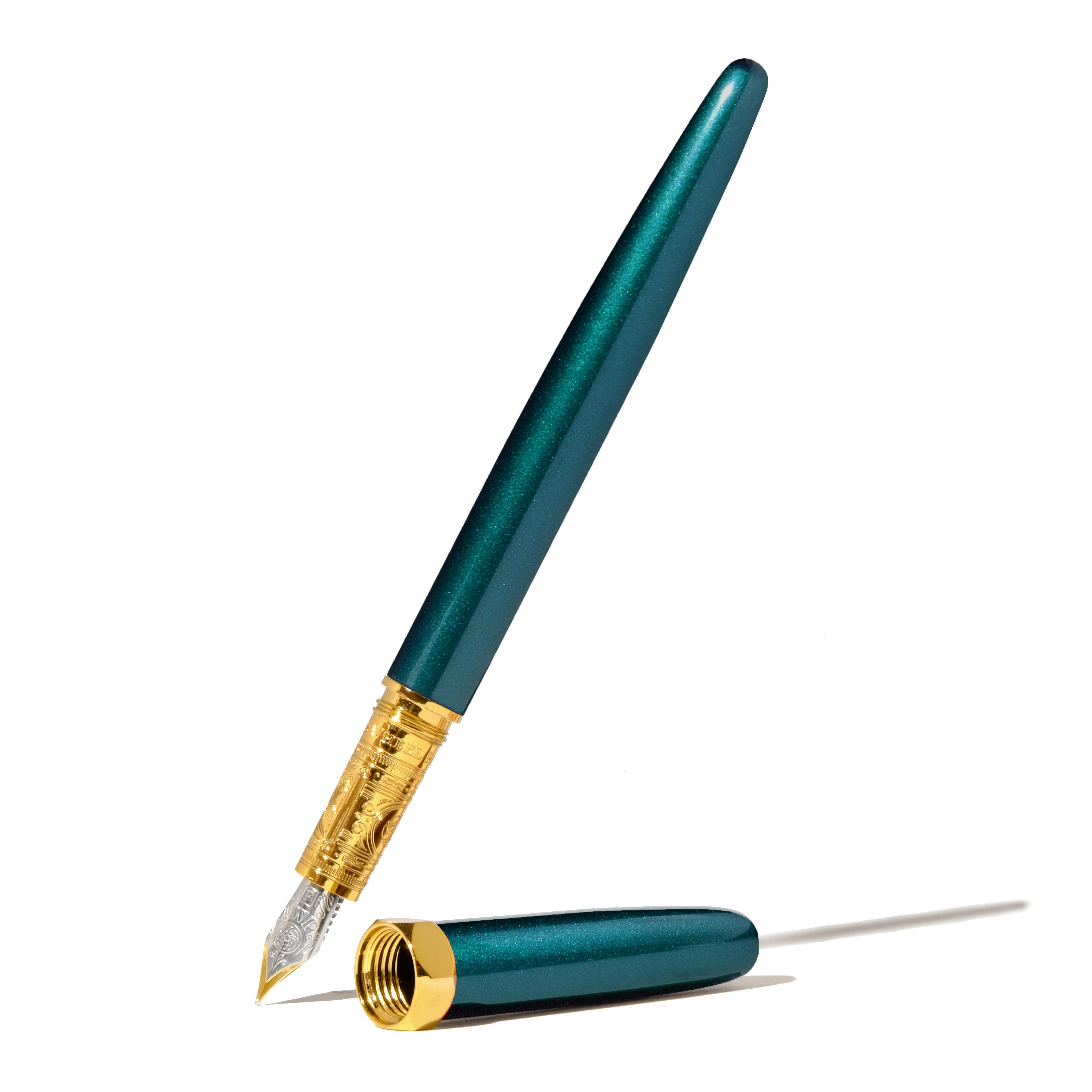 This Bijou Fountain Pen is carefully crafted from brass in a rich dark teal pink with sapphire lacquer finish. It features a double gold-plated highly detailed engraved grip area and it's fitted with a bicolour steel nib in a choice of sizes. Ferris Wheel Press advise against posting this pen, as the threaded cap will damage the lacquer coating.