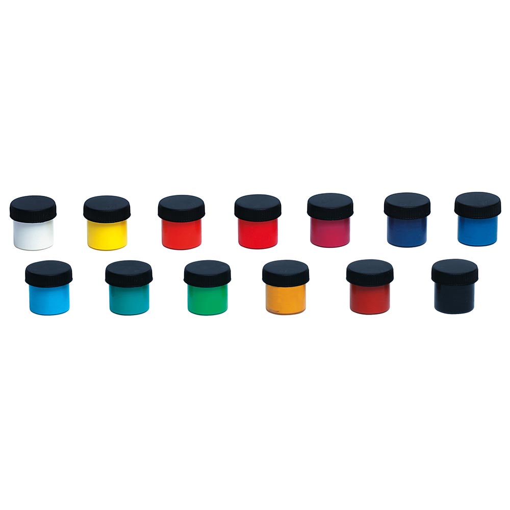 Set of 13 18ml water-based paint pots in assorted vibrant colours. Perfect for introducing kids to painting.