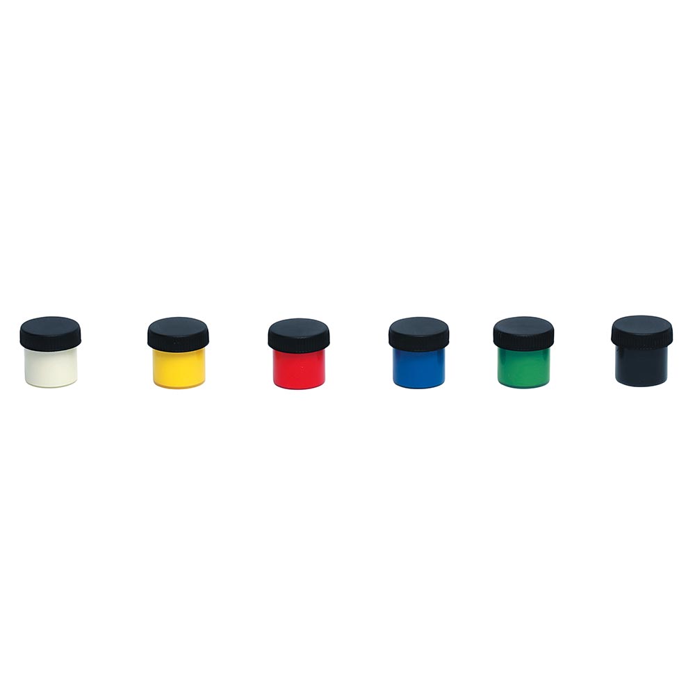 Set of 6 18ml water-based paint pots in assorted vibrant colours. Perfect for introducing kids to painting.
