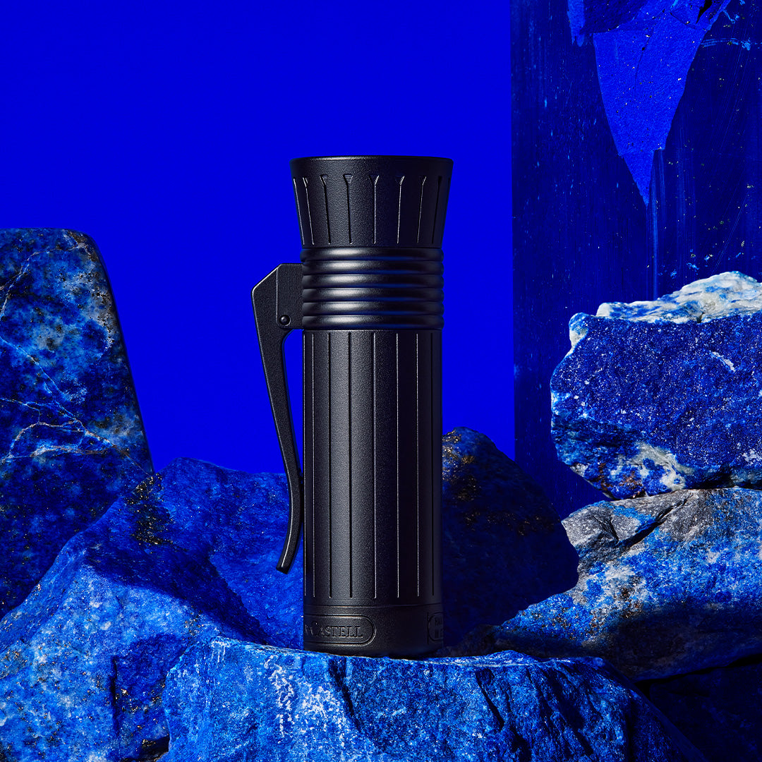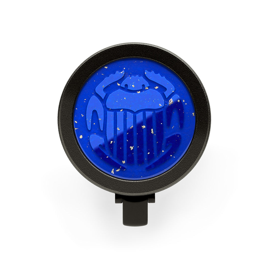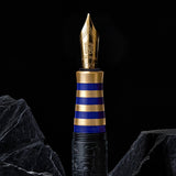 Moving on to the cap which features a pinstripe design and is designed in the shape of the Nefertiti's cap crown. It's made from the same material as the barrel, comes with a sturdy pocket clip and features the same highly resistant diamond like carbon coating as the barrel. The end piece shows off reconstructed lapis lazuli engraved with the scarabaeus symbol.