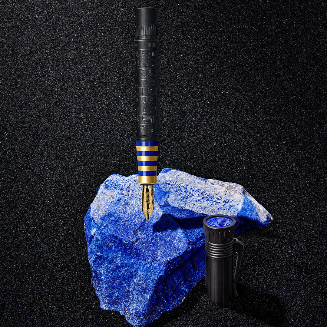 The grip section is features a prominent 24-carat gold plated and blue lacquered ring design. The colours selected are the same as the death mask of Tutankhamun.