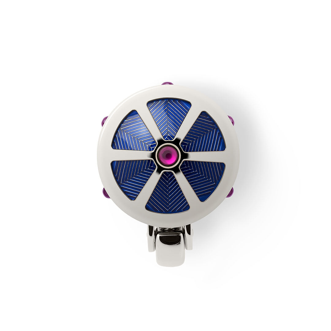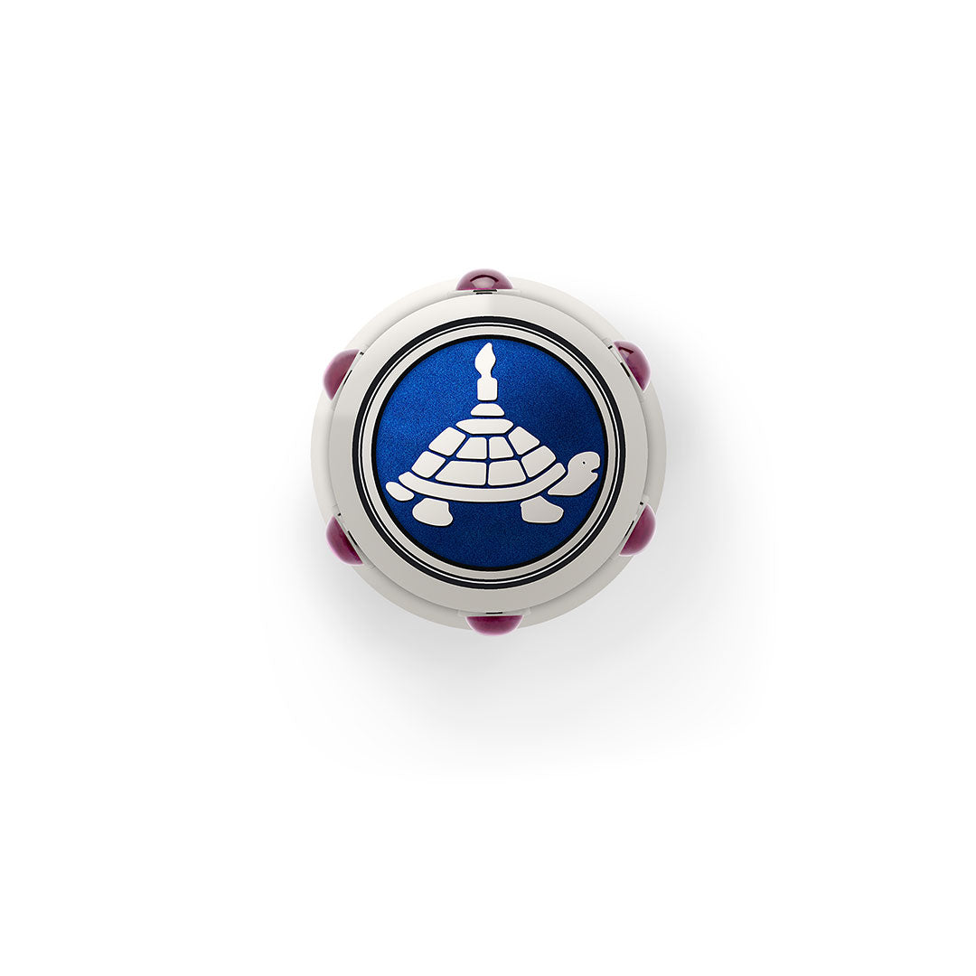 The overall pen design is influenced by Ottoman tents, with its blue and silver stripes and jewelled tassel designs. Each pen is studded with 18 rubies. The end of the cap features a tortoise with a candle on its back. Ottoman Sultans would stick candles onto the shells of tortoises, so as the tortoises explored the tulip gardens at night, the lights could be seen 'floating' among them, a reminder to the Sultans to take things slowly and allow time for contemplation.