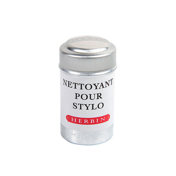 J. Herbin fountain pen cleaning solution supplied as a tin of 6 cartridges. Suitable for any pens that use standard international cartridges. Fit a cleaning cartridge as you would an ink cartridge, and squeeze the cartridge repeatedly to flush the cleaning fluid through the pen's feed. Follow up by flushing through with water - either use a converter, or use the now empty cleaning cartridge again.