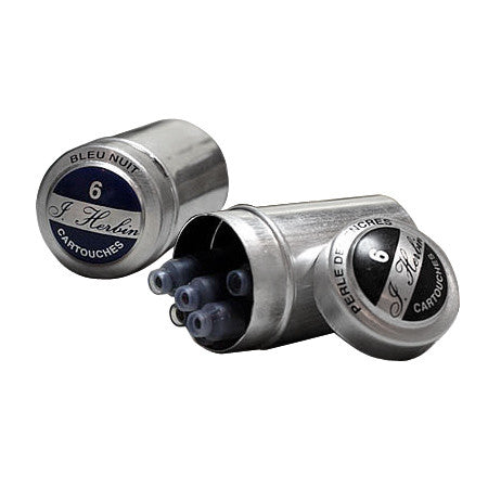 Pack of 6 cartridges, presented in a tiny, neat cylindrical metal tin.
