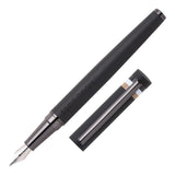 Loop Iconic Fountain Pen by Hugo Boss. Brass barrel with soft lacquer coating. Minimalist black finish with Hugo Boss engraved to the side. Polished black trim and pocket clip. Signature black white & camel cap band. Medium stainless steel nib.