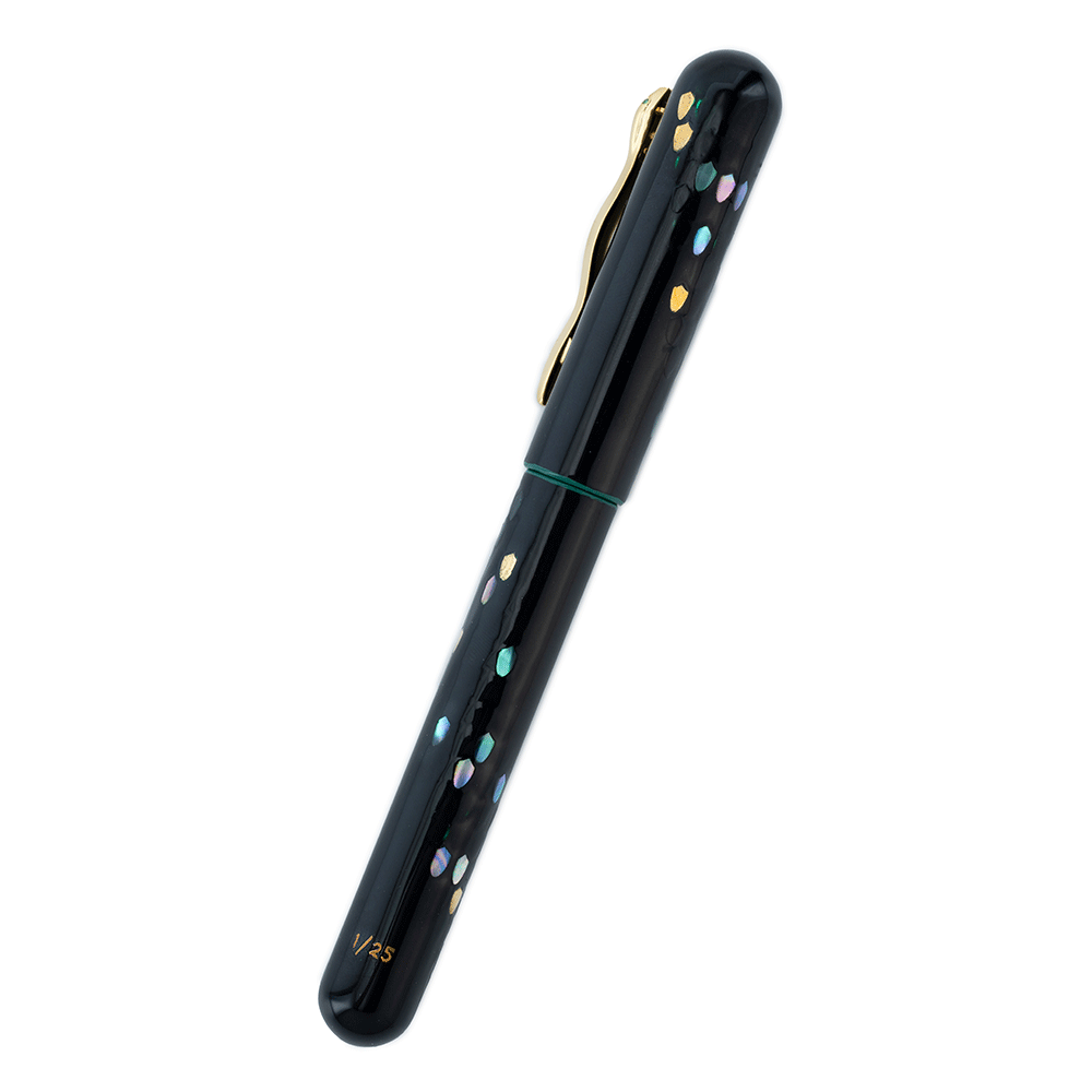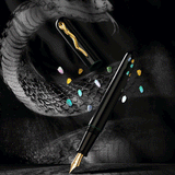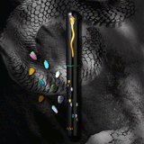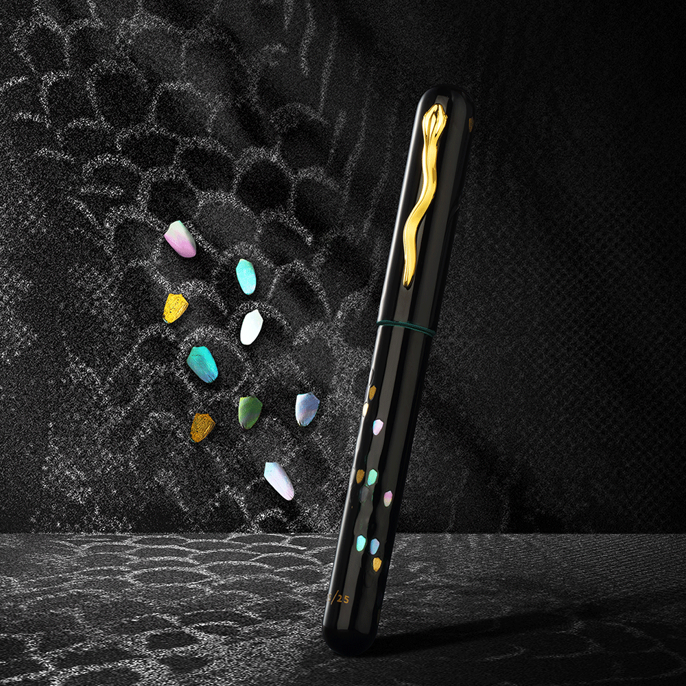 Iridescent pieces of shell embedded in the urushi lacquer by the Japanese 'raden' technique are shaped like the scales of a snake, while the clip is a snake, slithering up the pen's cap.