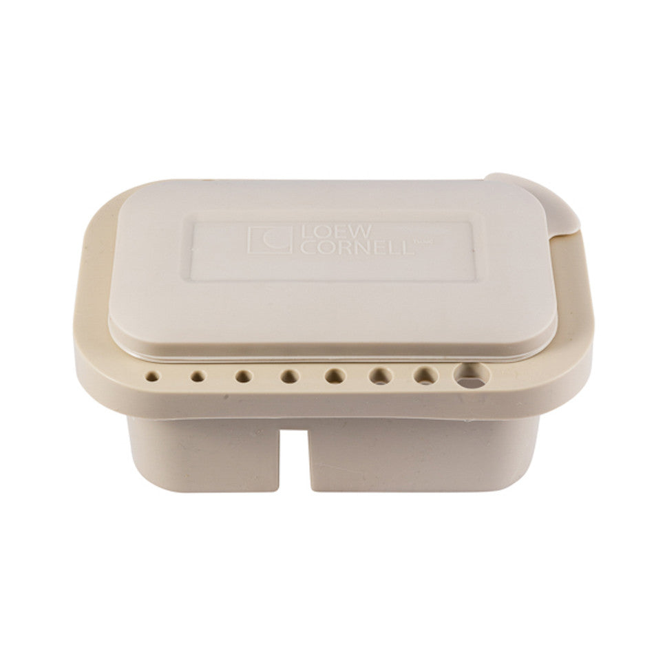 Artists' brush tub. The lid doubles up as a palette and there are differing sized holes around the lip of the tub to accommodate a number of brushes.