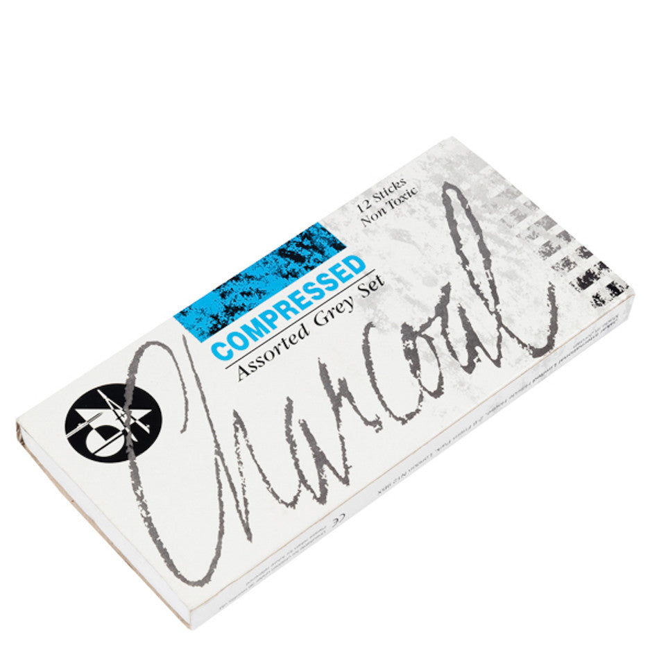Set of 12 sticks of compressed charcoal in shades of grey, from ivory up to anthracite, supplied in a protective cardboard sleeve.
