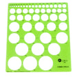 Metric Circles Template from Jakar featuring 50 different sized circles. Template measures 183mm x 208mm x 0.76mm. Circle diameters range from 2mm up to 39mm. Made from green impact-modified acrylic with silk screen printing.