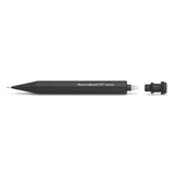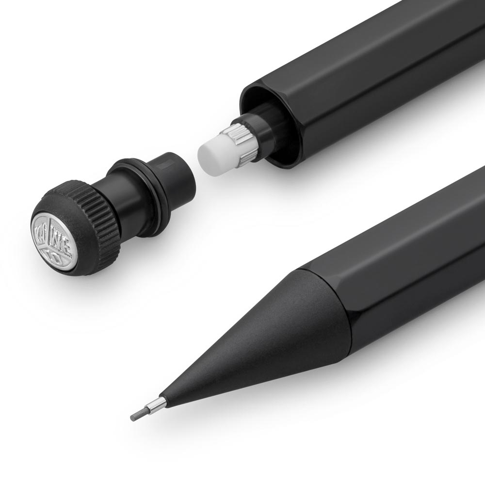 Kaweco Aluminium Special Mini Pencil is a sleek, minimalist octagonal barrel design in matt black. Solid anodised aluminium build. Unusually compact and with an unusual range of lead sizes including 0.5mm, 0.7mm, 0.9mm or 2mm. Click-advance action. 0.5, 0.7 and 0.9mm pencils feature an eraser under the push-button, which features the Kaweco logo on the end.