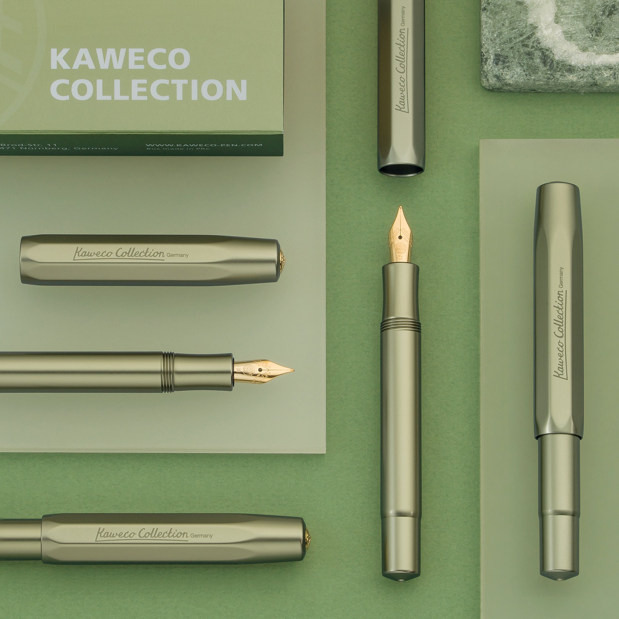 The Kaweco Collection takes favourite fountain pens and gives them a finish and trim uncommon for the range. In this case, the Classic Sport is in a brand new colour: Olivine, a golden olive green that's beautifully set-off by a gold-plated stainless steel nib and gold-coloured Kaweco logo on the end of the cap.