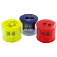 A two-hole sharpener with one hole for coloured pencils and another for standard graphite pencils. The blades are designed to create a sharp point on the graphite side and a rounded point on the coloured pencil side. Coloured leads are softer than graphite so tend to break more if the tip is too sharp so this simple design helps create the right tip on your pencils, as well as keeping the blades nice and clean.