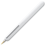 Fully-retracting nib hides behind a secure valve seal. Sprung clip partially retracts into the body as the nib extends to facilitate a comfortable writing experience. Lustrous piano white barrel finish with polished chrome finish to clip. Bi-colour 14-carat gold nib. 13.5mm wide, and weighs 46g.