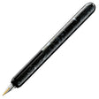 Fully-retracting nib hides behind a secure valve seal. Sprung clip partially retracts into the body as the nib extends to facilitate a comfortable writing experience. Lustrous piano black pocket clip. Bi-colour 14-carat gold nib. 13.5mm wide, and weighs 46g.