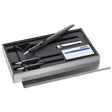 joy AL set contains one of each nib in 1.1mm, 1.5mm and 1.9mm, one barrel and cap, plus a pack of T10 cartridges in blue ink. Calligraphy leaflet provides hints and tips on creative handwriting. Supplied in a smart metal tin.